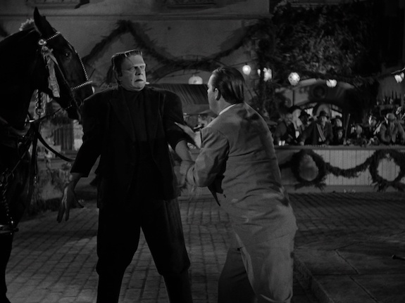This is really a sequel to The Wolf Man and as far as the Frankenstein Monster goes, he’s merely a supporting character. This means you get lots of scenes of Chaney reprising the Larry Talbot gimmick, which involves a lot of sweaty hyper activity as he alternately tries to convince everyone that he is a werewolf and bitches and moans about how awful he has it and why won’t somebody kill him? I should also add that at times, Lon resembles Shemp Howard.
